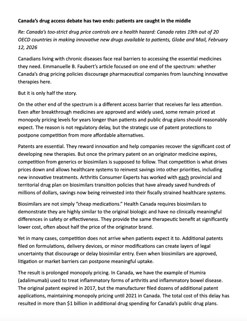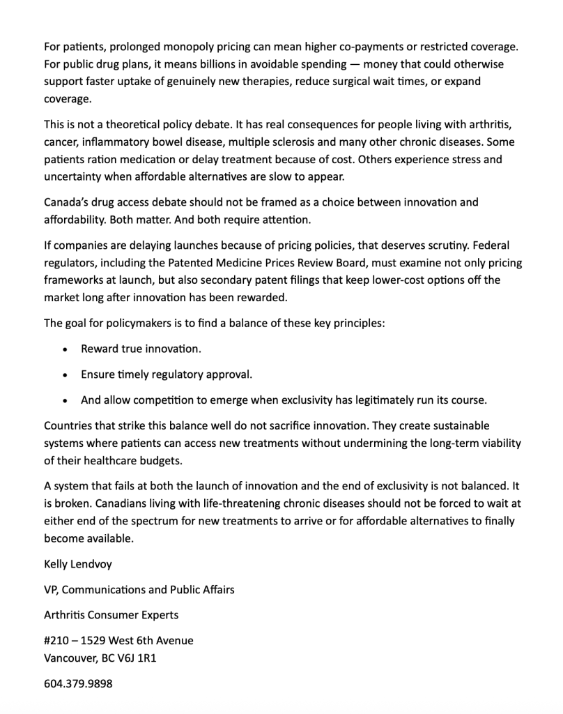 “Canada’s drug access debate has two ends: patients are caught in the middle,” Op-Ed by Arthritis Consumer Experts (ACE)