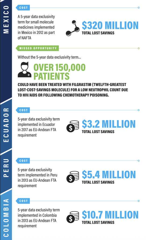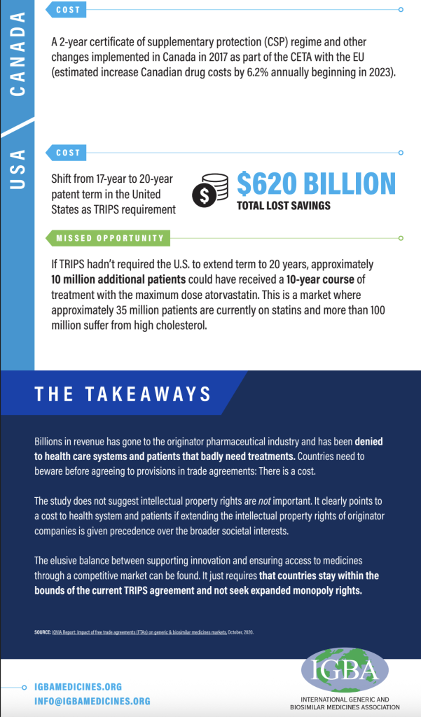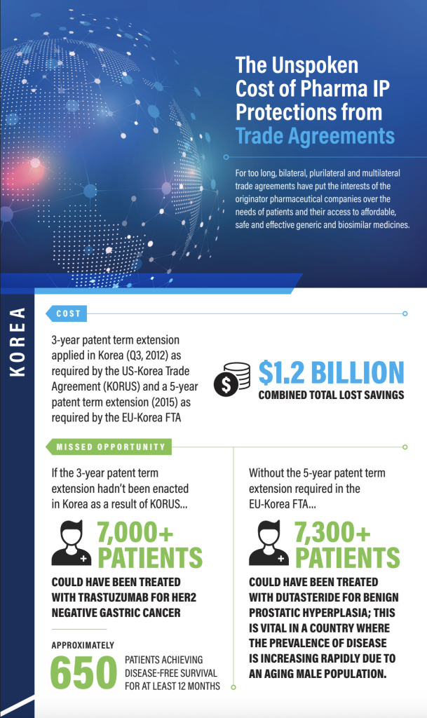 The infographic below, developed in 2020 by the International Generic and Biosimilar Medicines Association, illustrates how trade agreements can increase drug prices by embedding extended intellectual property protections, including patent linkage and exclusivity extensions. It highlights the financial and health impacts on both patients and healthcare systems in different countries.